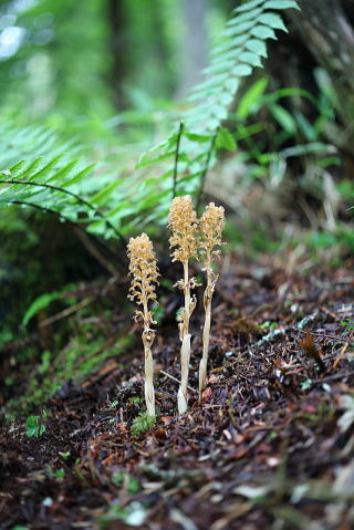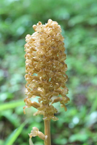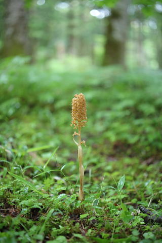 昨年、ここで群生したサカネランに出会いました。だいぶ花期は過ぎていましたが、これほど多くの個体を見たのは初めてだったので、1年後に再訪してみました。個体数は昨年の3分の1程度と少なかったものの、地元の方から、これはサカネランではなくエゾサカネランだと教えていただきました。子房や花序軸に微毛がないこと、色が濃いことが特徴ということです。 |