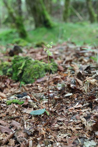 ブナ帯の樹林下に生えるコイチヨウランの仲間で、分布は埼玉県、東京都、神奈川県、山梨県、静岡県、それから少し離れて奈良県に分布するそうです。唇弁に鋸歯があるのが特徴で、コイチヨウランの素朴な印象に対してこちらはとても洗練された感じがします。 |