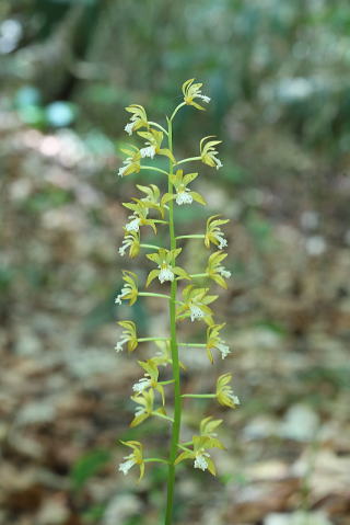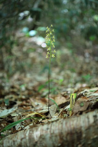 小さいながらも、唇弁が白、ほかが黄褐色という組み合わせで、遠くからだと目立ちませんが、近づいて見るとかなり美しい花をしています。縦に筋の入った細長い葉も味わい深いものがあります。 |