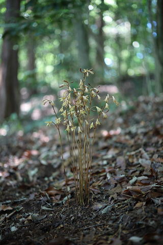 その名のとおり、無葉の腐生ランです。遠くからでは目立ちませんが、近くで見ると美しい花をしています。写真の個体は、ちょうど同じ高さの2つの個体が折り重なるように咲いていたものです。 |
