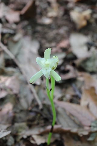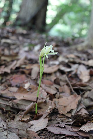 どう見てもマヤランのアルビノのような感じがします。この周辺には同じ時期にマヤランも咲いているので、やはり関係があるのでしょうか。ほかの場所でもマヤランの近くにサガミランモドキが咲いているのを見たことがあります。 |