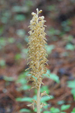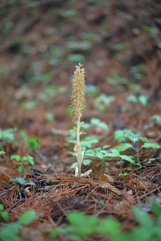 全体的に淡い黄褐色をした腐生ランです。このサカネランの花も人の姿のような形をしていて、ポケモンに出てくるキャラクターのような感じがします。かなり個体数が少なく、なかなか出会うことができないランのひとつです。 |