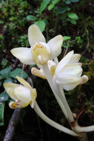 清楚な花で一点の曇りもないような美しいランです。今までキバナノショウキランとされていたそうですが、2001年に新種として発表されました。たしかにキバナノショウキランは漢方薬の素材にもなりうそうな色に対して、こちらはほのかに甘い南国系フルーツといった趣があります。 |