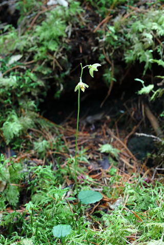 針葉樹林下に生えるランです。葉に比べるとかなり繊細な花茎がひょろひょろと伸び、先端にいくつかの小さな黄色い花を咲かせます。登山道沿いなどでよく見かけますが、高さが10センチ程度と小さく目立たないので、頂上を目指した登山だと見過ごしてしまうかもしれません。この個体はカラスバといわれる紫色の葉をしていました。 |