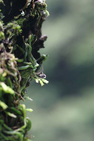 蜘蛛に似ていることからの命名だそうですが、全体の雰囲気としてはエイリアンの幼生といった感じがします。植物ということもあり動かないので安心できるのですが、これが人の顔に着生してしまったらかなり怖いものがあります。 花はかなり小さく、等倍以上のレンズで再度挑戦したいところです。 |