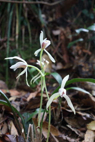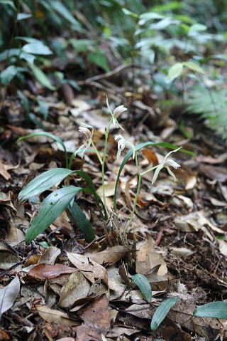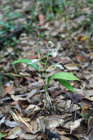 常緑樹林下に生えるシュンランの仲間です。同じシュンラン属でも、葉のないマヤラン、葉が細長く何枚もの葉をつけるシュンラン、幅が広く数枚の葉をつけるナギランと、それぞれ環境に適応し、果てしない歳月をかけて分化してきたのでしょうが、人為による環境変化や盗掘は、一瞬の出来事なので、対応できる余地がありません。 |