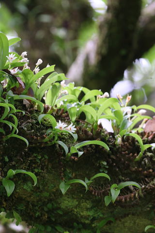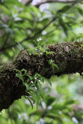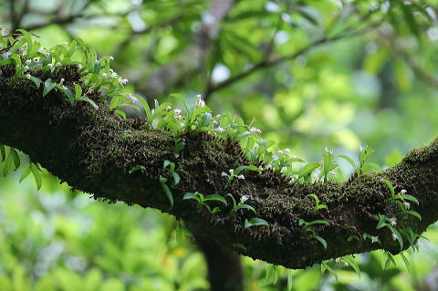 常緑広葉樹の樹上や岩上に生える着生ランです。花は3日程度しかもたないということでしたが、どうにか花を見ることができました。かなり高い樹上に生えていましたが、もう少し近くで観察したいものです。 |